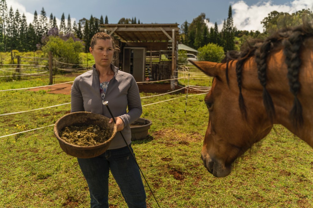 To begin training ground manners around feeding bring a whip with you to help establish your personal bubble of space. When you step into the stall, pasture or paddock and your horse approaches you with ears pinned you can swing the wip left and right in front of her legs. If your horse stops great, if he/she proceeds forward change the direction of your whip to up and down in front of his/her face to get his/her attention. Please note, the idea isn’t to make contact with your horse, just to establish your space and presence. Although your horse may walk into the whip… but they will likely only do that once.