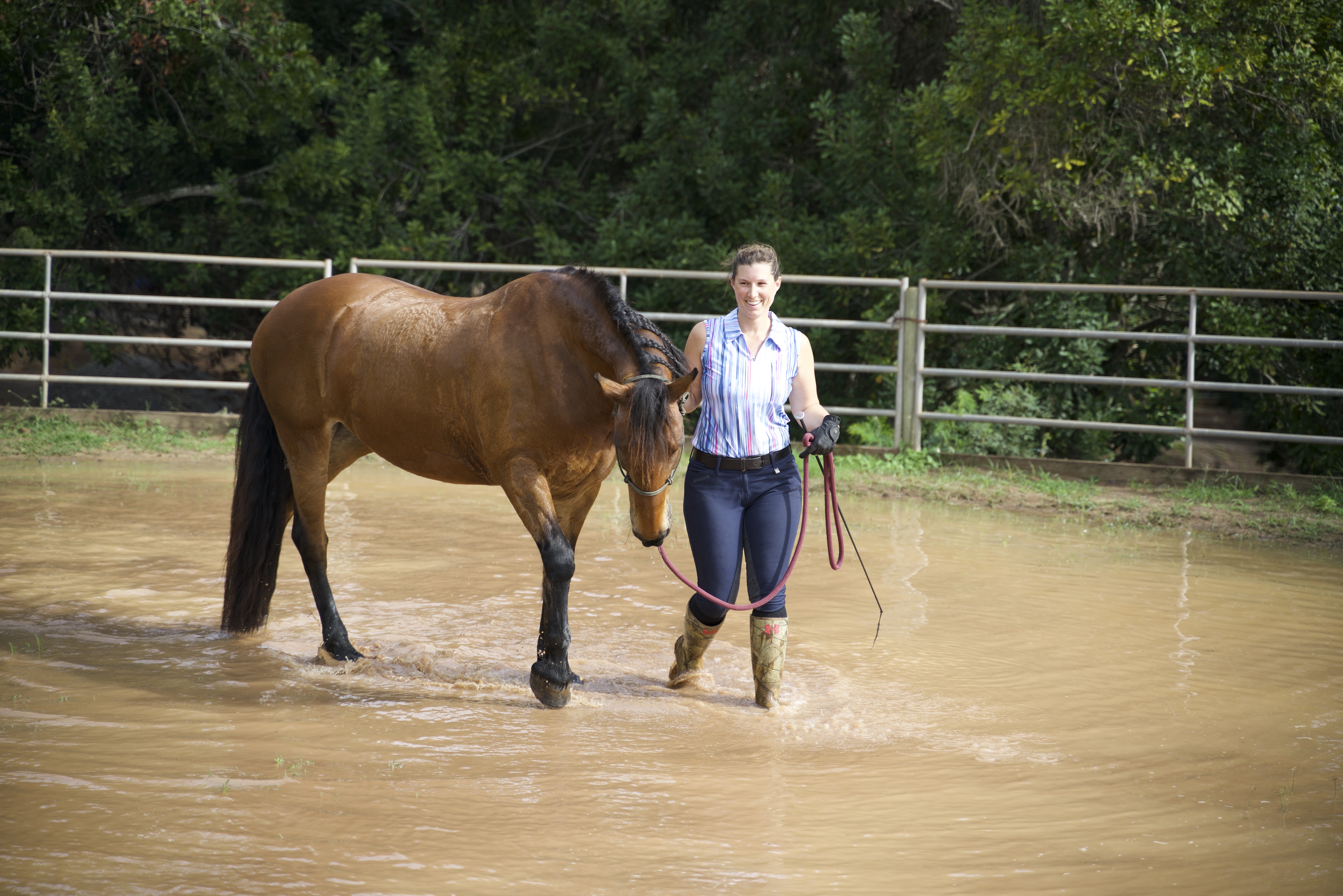 The ground was really too wet to safely ride; the trails were saturated and the arena was being used by lessons. Hmmmm, what was I going to do today? As I stood there gazing out across the farm and in particular the flooded round pen, an idea sparked. I had never taken Athena through water and therefore I had no idea how she would react. Will she have fun in it? Will she avoid it? Will she be afraid of it? I had an Arab growing up who was petrified of the water. Not a great combo when hacking out.