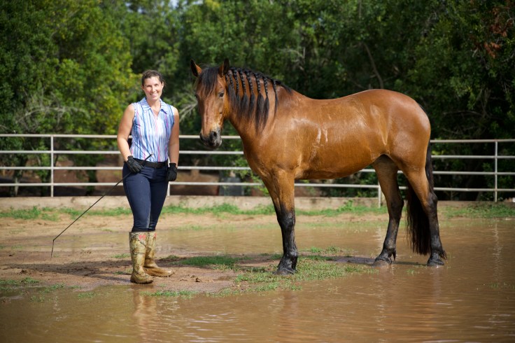 So often as riders we get focused on just riding. We forget that there is so much more to training and creating a well balanced horse than what goes on in the saddle. We expect our horses to behave in the exact moment we need them to, whether it is at a horse show or just during a lesson or even for a free ride. But, have we put in the time to expose our horses to all the different elements in our human world? You can’t predict or control the weather and one day you may have to ride a Dressage test in the rain. Have you ever worked in the rain before? Or on a trail ride, you just might encounter a puddle. Are you and your horse prepared?