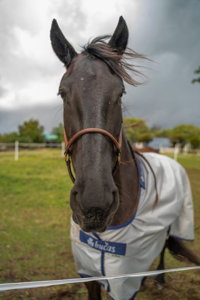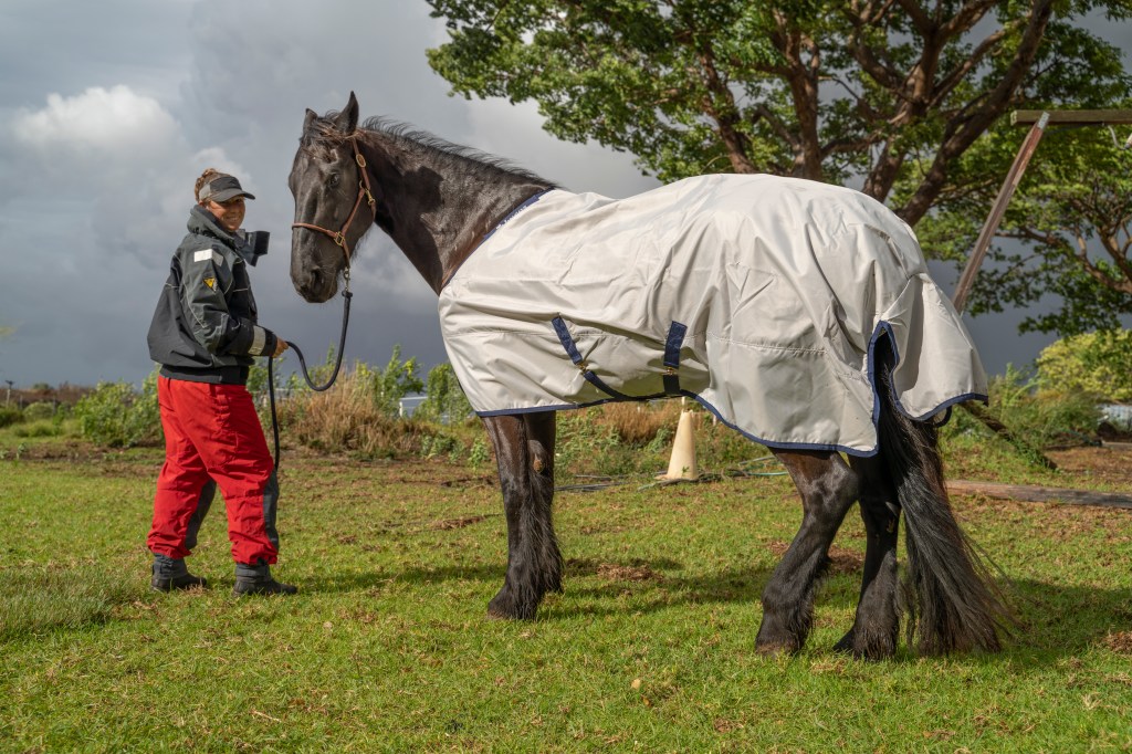 So back to the original question…what do we do? I’m proud to say that after hours of research… and I do mean hours… I discovered the Bucas Sun Shower rain sheet. The Sun Shower rain sheet is made of a lighter weight 840 denier. Athena and Izzie both have one. Can you say “twins”. They are a reflective silver color, with a mesh lining to keep air circulating under the blanket. The mesh linning and reflective color, combined with the lighter weight fabric all help the horses stay cool and also perfectly warm and comfortable. Because of the mesh lining you can put the blanket on when the horses are wet. I love this feature, as I’m often not at the barn before the rain starts… and let’s be honest..who puts a blanket on BEFORE the rain starts. That may also be a Maui problem… with our warm weather you really don’t want to blanket before the weather turns nasty anyway. So there I am, trying to dry a wet horse off with a towel. It takes forever and you usually don’t get them that dry anyway. With the Bucas Sunshower I can do a quick towel dry and then put their sheets on. It gives me a little more wiggle room when it comes to putting the blanket on and also removing when the storm has passed. The fit is also fantastic. I love the darts on the shoulder. It puffs out and doesn’t rub the girls big Friesians shoulders. The overall cut fits both the girls so well. Happy horses!