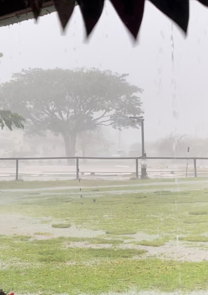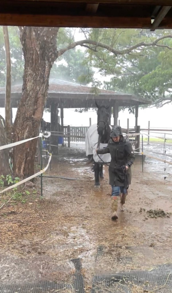 30kt winds, sideways pouring rain, water drops the size of gumdrops. Sloppy paddocks and gutterless barns. Not entirely a picture perfect tropical post card.